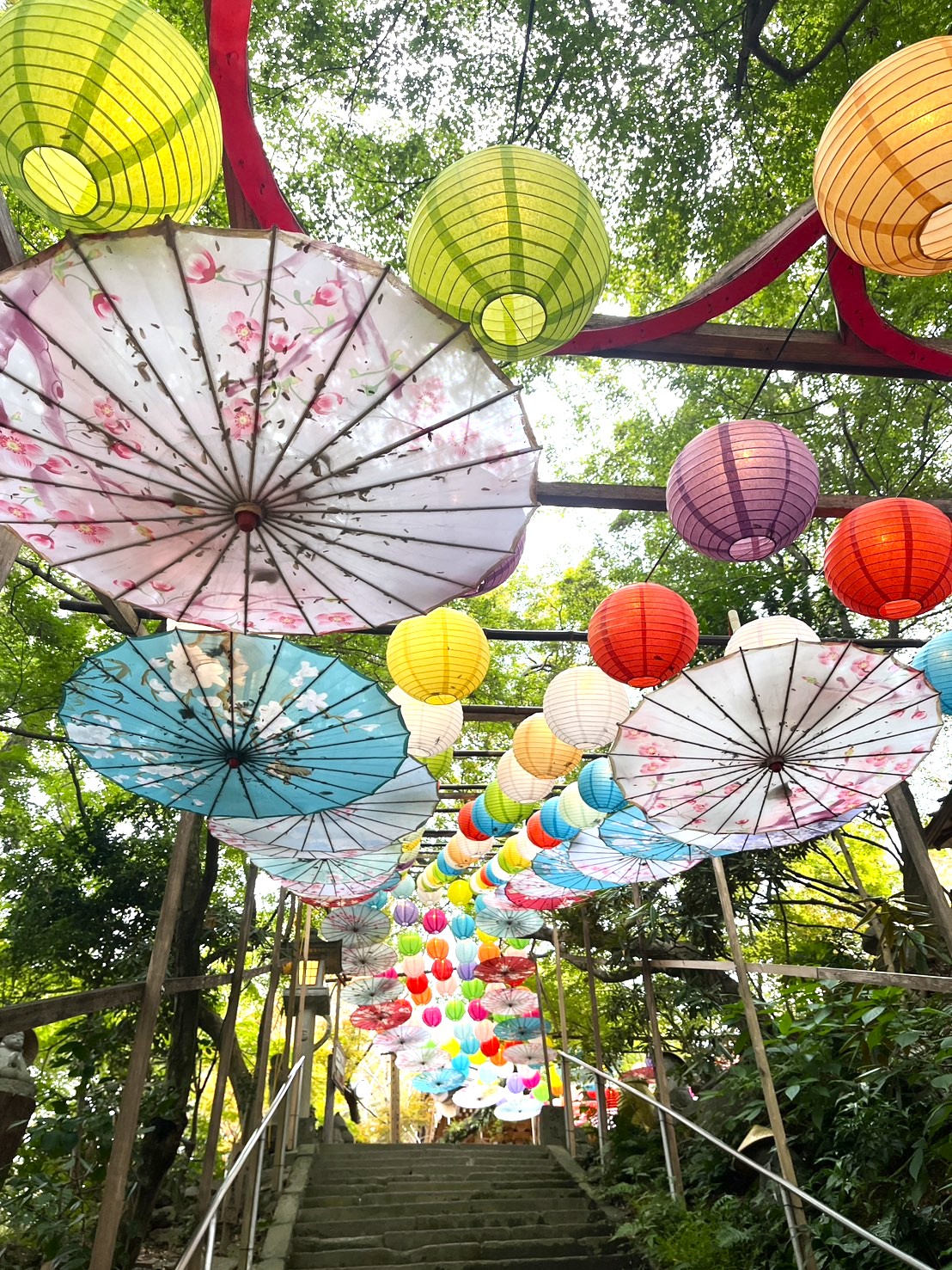 本堂に続く階段には素敵な和傘とカラフルな提灯が♪